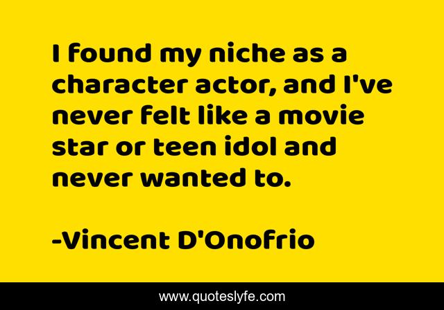 This page presents the quote "I found my niche as a character actor, and I've never felt like a movie star or teen idol and never wanted to.". Author of this quote is Vincent D'Onofrio. This quote is about character, actor,.