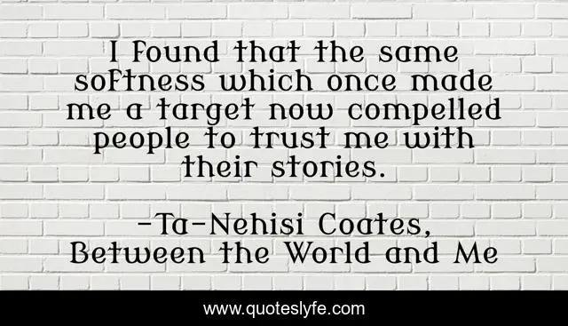 This page presents the quote "I found that the same softness which once made me a target now compelled people to trust me with their stories.". Author of this quote is Ta-Nehisi Coates, Between the World and Me. This quote is about counseling, vulnerability, listening, rapport,.