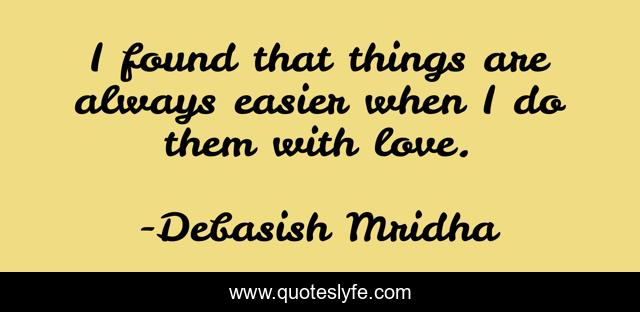 This page presents the quote "I found that things are always easier when I do them with love.". Author of this quote is Debasish Mridha. This quote is about life, love, knowledge, inspirational, intelligence, philosophy, wisdom, quotes, affection,.