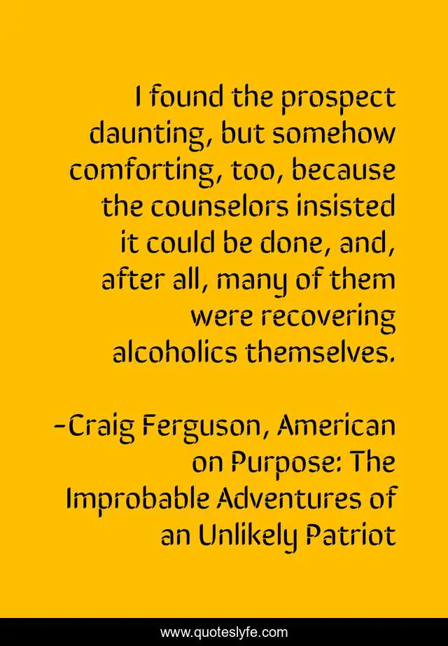 This page presents the quote "I found the prospect daunting, but somehow comforting, too, because the counselors insisted it could be done, and, after all, many of them were recovering alcoholics themselves.". Author of this quote is Craig Ferguson, American on Purpose: The Improbable Adventures of an Unlikely Patriot. This quote is about rehab, comfort, alcoholism, recovery,.