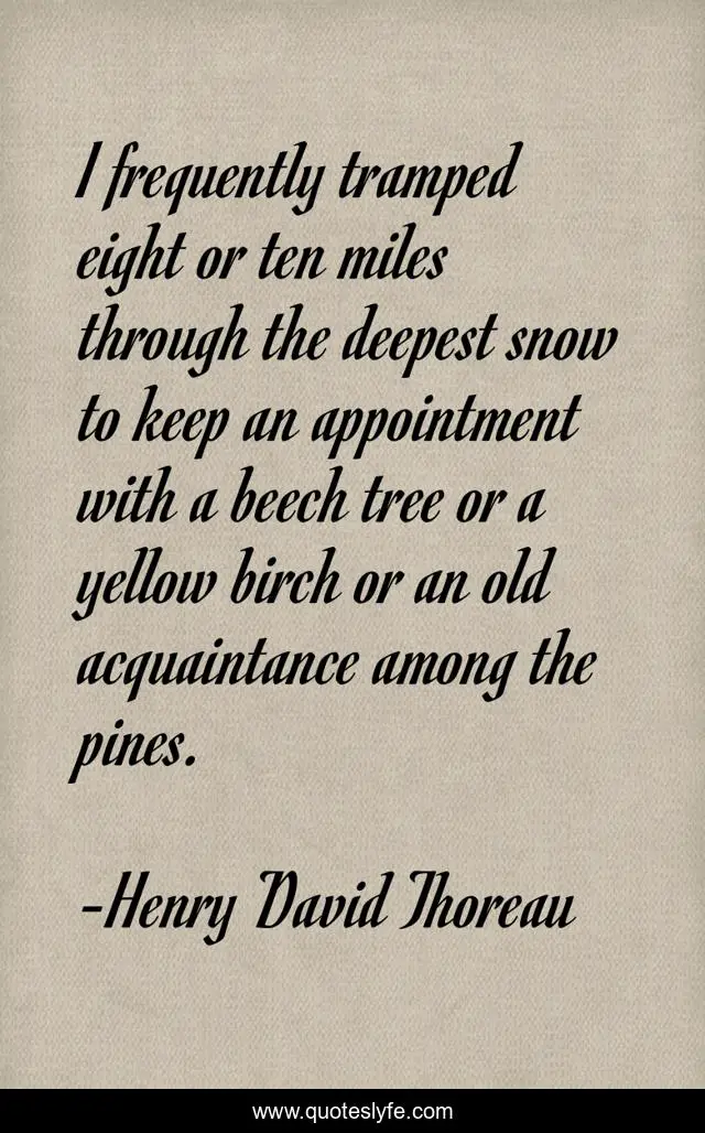 This page presents the quote "I frequently tramped eight or ten miles through the deepest snow to keep an appointment with a beech tree or a yellow birch or an old acquaintance among the pines.". Author of this quote is Henry David Thoreau. .