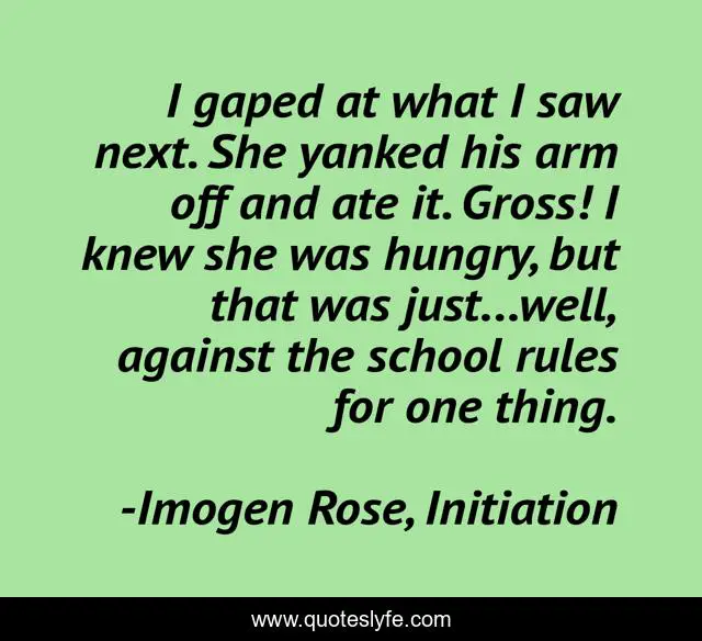 This page presents the quote "I gaped at what I saw next. She yanked his arm off and ate it. Gross! I knew she was hungry, but that was just...well, against the school rules for one thing.". Author of this quote is Imogen Rose, Initiation. This quote is about humor, paranormal,.
