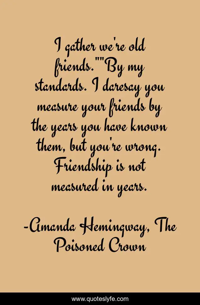This page presents the quote "I gather we're old friends.""By my standards. I daresay you measure your friends by the years you have known them, but you're wrong. Friendship is not measured in years.". Author of this quote is Amanda Hemingway, The Poisoned Crown. This quote is about friends, friendship,.