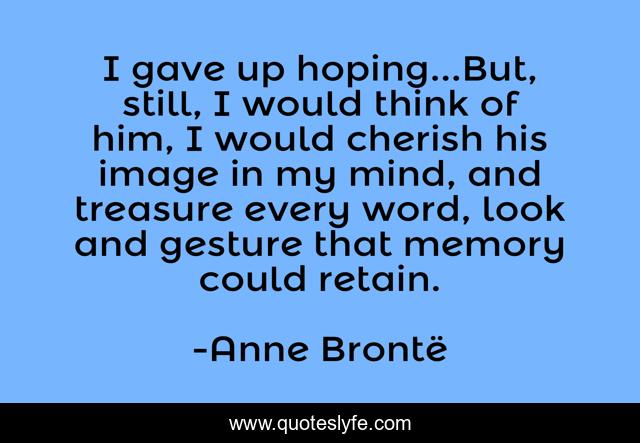 This page presents the quote "I gave up hoping...But, still, I would think of him, I would cherish his image in my mind, and treasure every word, look and gesture that memory could retain.". Author of this quote is Anne Brontë. This quote is about longing, love, affection,.