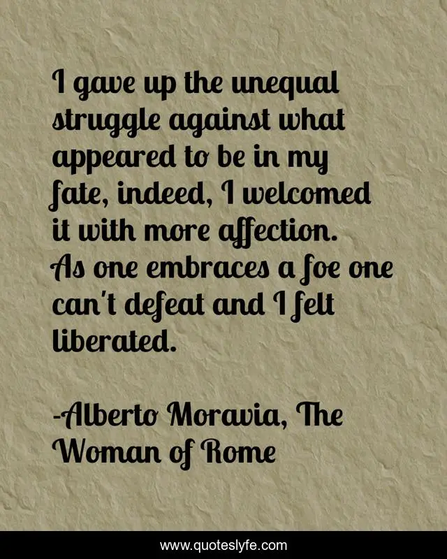 This page presents the quote "I gave up the unequal struggle against what appeared to be in my fate, indeed, I welcomed it with more affection. As one embraces a foe one can't defeat and I felt liberated.". Author of this quote is Alberto Moravia, The Woman of Rome. .