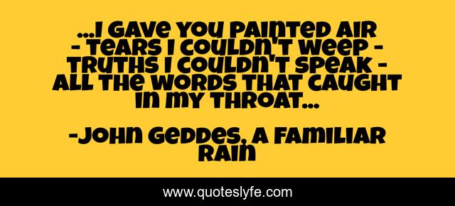 "John Geddes, A Familiar Rain Quotes." Quoteslyfe.com, 2025. Sat. 06 Dec. 2025. <https://www.quoteslyfe.com/quote/I-gave-you-painted-air-tears-I-113456>.