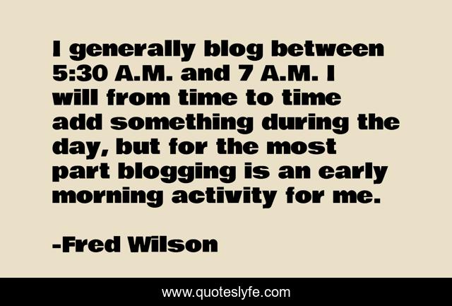 This page presents the quote "I generally blog between 5:30 A.M. and 7 A.M. I will from time to time add something during the day, but for the most part blogging is an early morning activity for me.". Author of this quote is Fred Wilson. This quote is about me, day, time,.