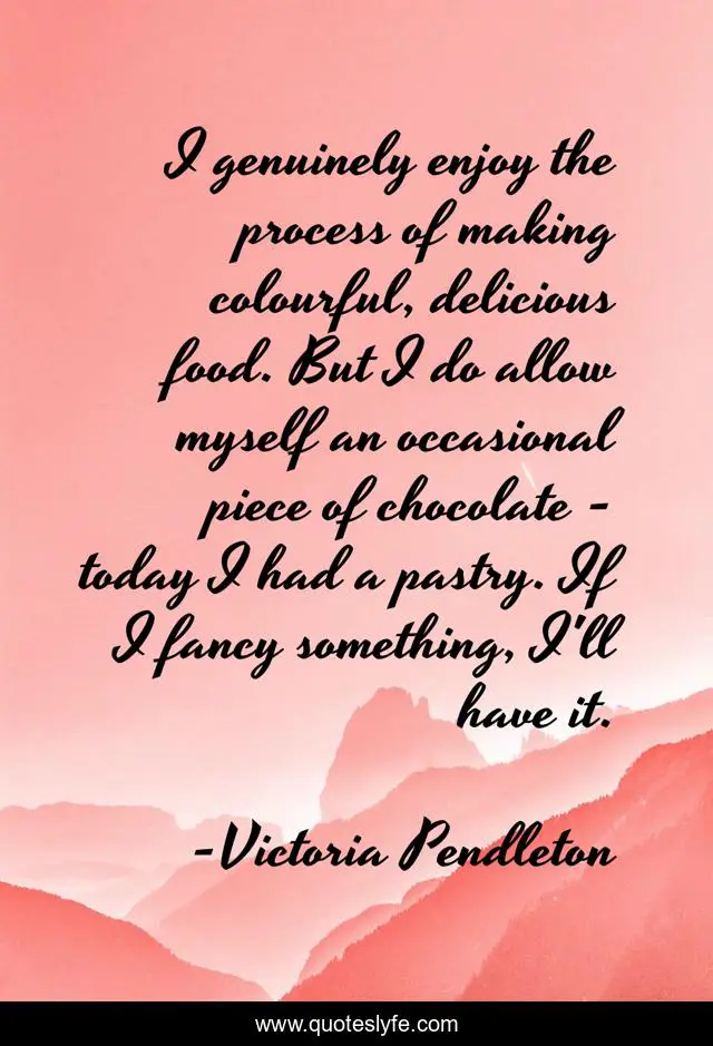 This page presents the quote "I genuinely enjoy the process of making colourful, delicious food. But I do allow myself an occasional piece of chocolate - today I had a pastry. If I fancy something, I'll have it.". Author of this quote is Victoria Pendleton. This quote is about enjoy, myself, today,.