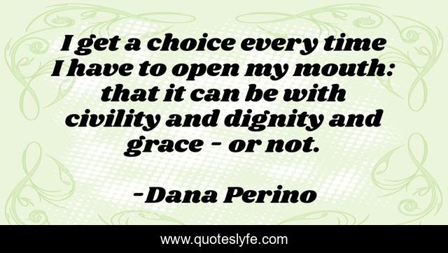 This page presents the quote "I get a choice every time I have to open my mouth: that it can be with civility and dignity and grace - or not.". Author of this quote is Dana Perino. This quote is about mouth, grace, choice,.