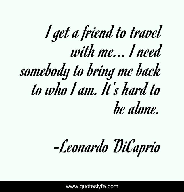 This page presents the quote "I get a friend to travel with me... I need somebody to bring me back to who I am. It's hard to be alone.". Author of this quote is Leonardo DiCaprio. This quote is about alone, me,.