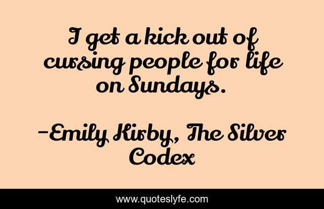 This page presents the quote "I get a kick out of cursing people for life on Sundays.". Author of this quote is Emily Kirby, The Silver Codex. This quote is about funny, humorous, muse, muses, horror-fantasy, comedy,.