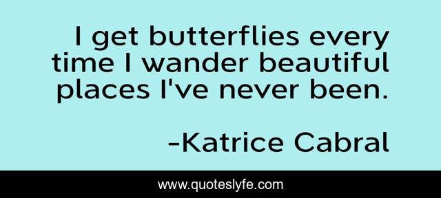 This page presents the quote "I get butterflies every time I wander beautiful places I've never been.". Author of this quote is Katrice Cabral. This quote is about wanderlust, life, journey, travel,.
