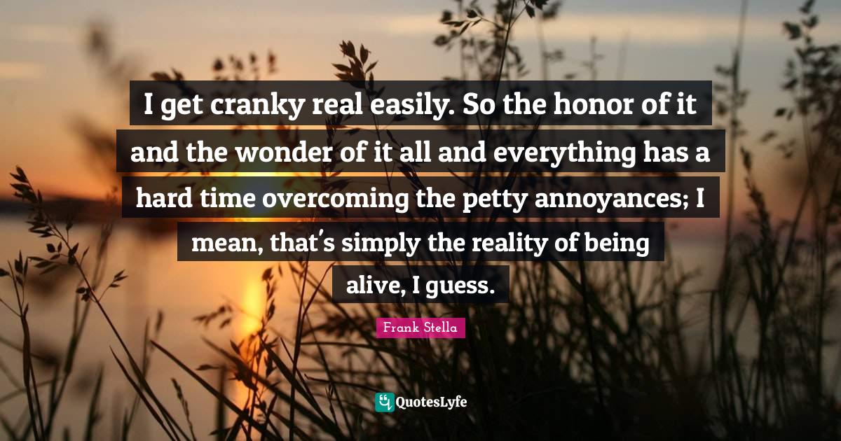 This page presents the quote "I get cranky real easily. So the honor of it and the wonder of it all and everything has a hard time overcoming the petty annoyances; I mean, that's simply the reality of being alive, I guess.". Author of this quote is Frank Stella. This quote is about overcoming, reality, time, honor, hard times, cranky, wonder, alive, mean,.
