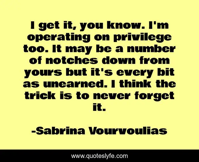 This page presents the quote "I get it, you know. I'm operating on privilege too. It may be a number of notches down from yours but it's every bit as unearned. I think the trick is to never forget it.". Author of this quote is Sabrina Vourvoulias. This quote is about privilege, humility,.
