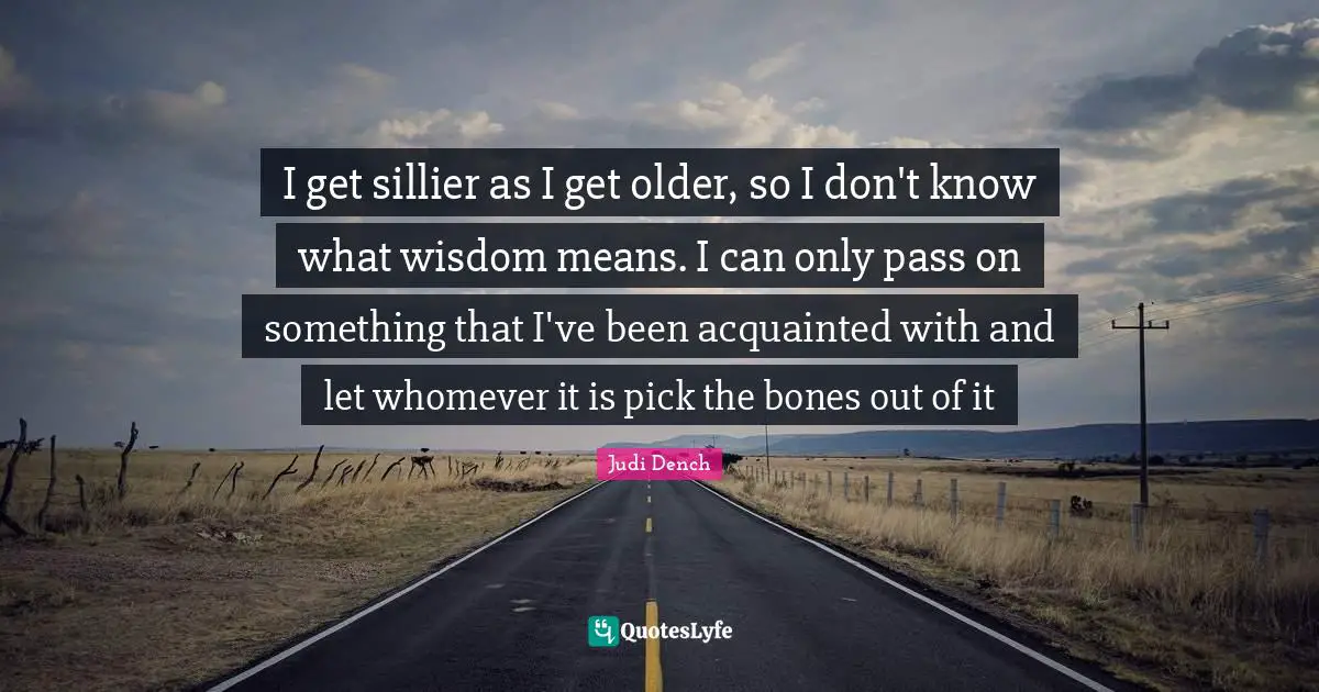 This page presents the quote "I get sillier as I get older, so I don't know what wisdom means. I can only pass on something that I've been acquainted with and let whomever it is pick the bones out of it". Author of this quote is Judi Dench. This quote is about wisdom, knows, mean, i can, bones,.