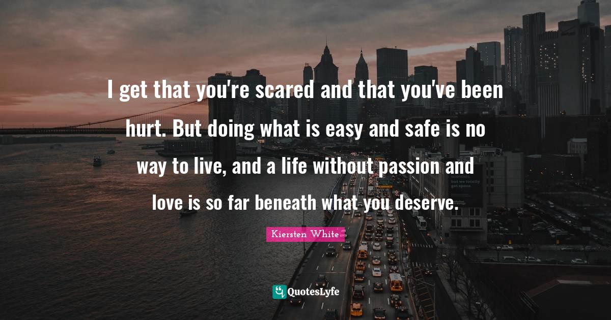 This page presents the quote "I get that you're scared and that you've been hurt. But doing what is easy and safe is no way to live, and a life without passion and love is so far beneath what you deserve.". Author of this quote is Kiersten White. This quote is about way to live, love, passion, life, what you deserve, easy, been hurt, and love, inspirational,.