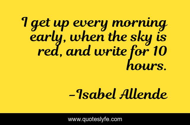 This page presents the quote "I get up every morning early, when the sky is red, and write for 10 hours.". Author of this quote is Isabel Allende. This quote is about early, sky, red,.