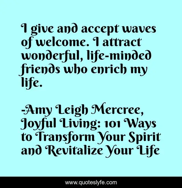 This page presents the quote "I give and accept waves of welcome. I attract wonderful, life-minded friends who enrich my life.". Author of this quote is Amy Leigh Mercree, Joyful Living: 101 Ways to Transform Your Spirit and Revitalize Your Life. This quote is about life, quotes-de-la-vida, amy-leigh-mercree, quotes-on-friendship, quote-of-the-week, friends, joyful-living, quotes-tumblr, joyful-living-101,.