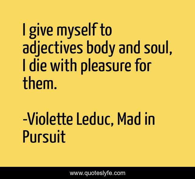 "Violette Leduc, Mad in Pursuit Quotes." Quoteslyfe.com, 2025. Sat. 06 Dec. 2025. <https://www.quoteslyfe.com/quote/I-give-myself-to-adjectives-body-and-27622>.