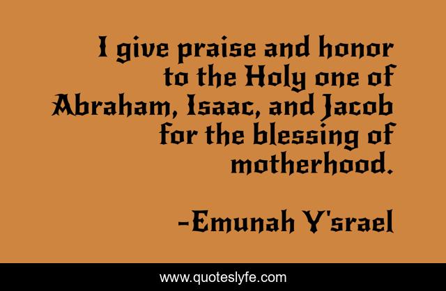 This page presents the quote "I give praise and honor to the Holy one of Abraham, Isaac, and Jacob for the blessing of motherhood.". Author of this quote is Emunah Y'srael. This quote is about motherhood, sons, womanhood, blessings,.