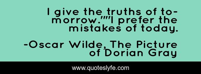 This page presents the quote "I give the truths of to-morrow.""I prefer the mistakes of today.". Author of this quote is Oscar Wilde, The Picture of Dorian Gray. This quote is about life-philosophy, philosophy,.