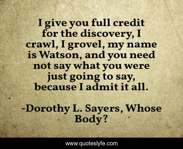 This page presents the quote "I give you full credit for the discovery, I crawl, I grovel, my name is Watson, and you need not say what you were just going to say, because I admit it all.". Author of this quote is Dorothy L. Sayers, Whose Body?. This quote is about watson, wrong, humour, sherlock-holmes,.