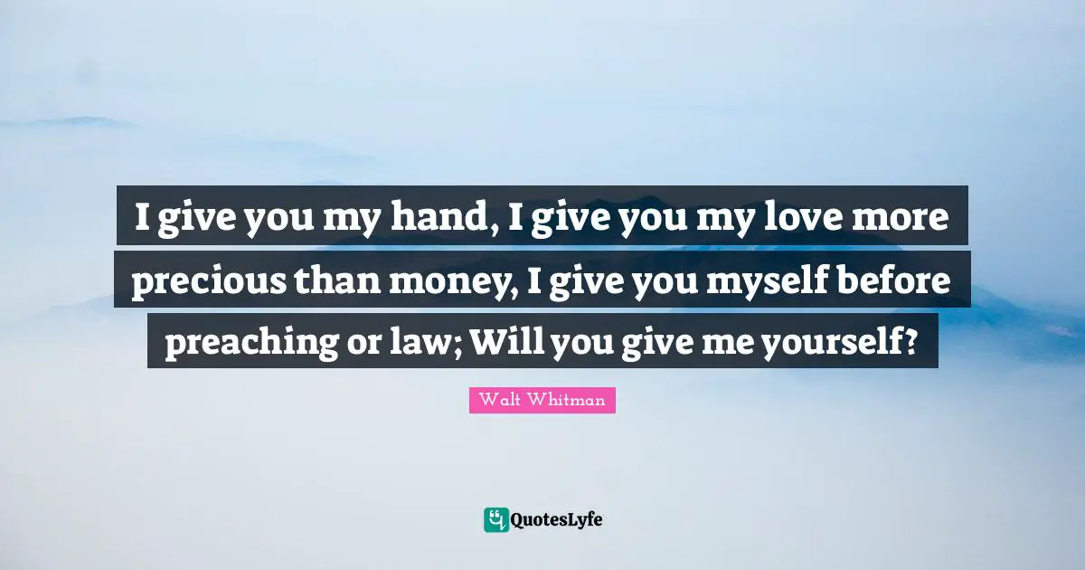 This page presents the quote "I give you my hand, I give you my love more precious than money, I give you myself before preaching or law; Will you give me yourself?". Author of this quote is Walt Whitman. This quote is about give me, money, affection, hands, law, love, preaching,.