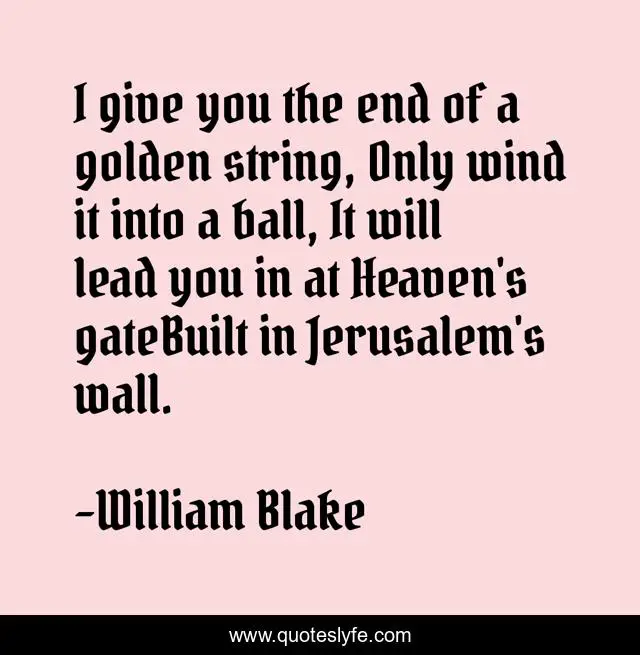 This page presents the quote "I give you the end of a golden string, Only wind it into a ball, It will lead you in at Heaven's gateBuilt in Jerusalem's wall.". Author of this quote is William Blake. .