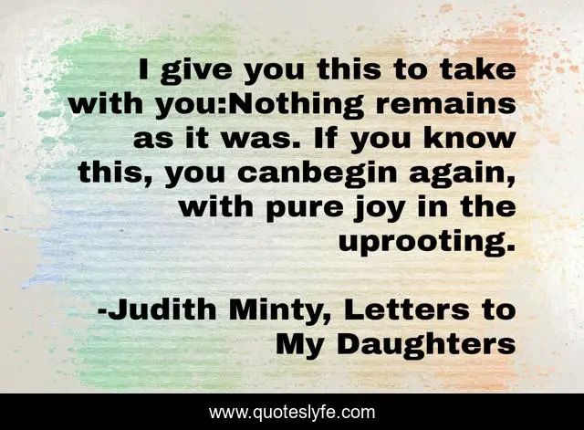 This page presents the quote "I give you this to take with you:Nothing remains as it was. If you know this, you canbegin again, with pure joy in the uprooting.". Author of this quote is Judith Minty, Letters to My Daughters. This quote is about rebirth, poetry, leaving, moving, time, change,.