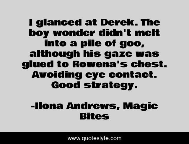 This page presents the quote "I glanced at Derek. The boy wonder didn't melt into a pile of goo, although his gaze was glued to Rowena's chest. Avoiding eye contact. Good strategy.". Author of this quote is Ilona Andrews, Magic Bites. This quote is about good-strategy, magic-bites, ilona-andrews, avoiding-eye-contact, rowena, fantasy, derek,.