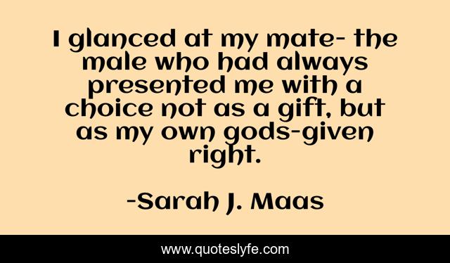 This page presents the quote "I glanced at my mate- the male who had always presented me with a choice not as a gift, but as my own gods-given right.". Author of this quote is Sarah J. Maas. This quote is about feyre, right, rhys, choice,.