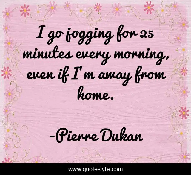 This page presents the quote "I go jogging for 25 minutes every morning, even if I'm away from home.". Author of this quote is Pierre Dukan. This quote is about home, jogging, away,.