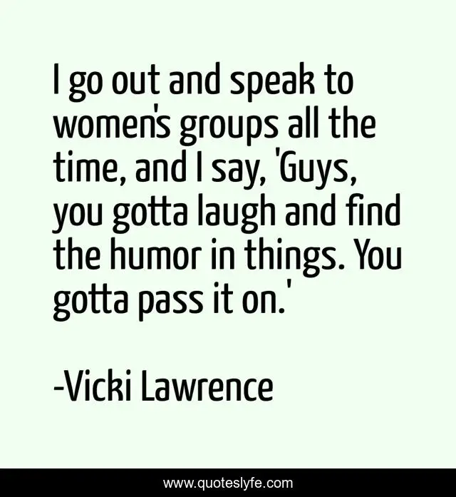This page presents the quote "I go out and speak to women's groups all the time, and I say, 'Guys, you gotta laugh and find the humor in things. You gotta pass it on.'". Author of this quote is Vicki Lawrence. This quote is about women, time, speak,.