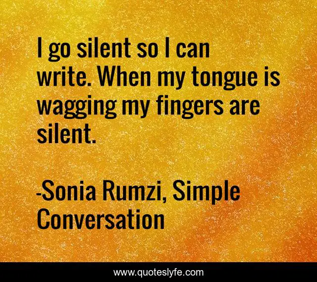 This page presents the quote "I go silent so I can write. When my tongue is wagging my fingers are silent.". Author of this quote is Sonia Rumzi, Simple Conversation. This quote is about tongue, silence, writing,.