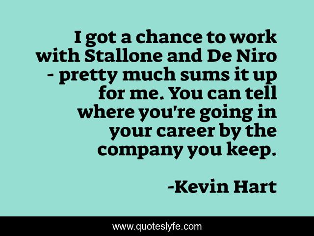 This page presents the quote "I got a chance to work with Stallone and De Niro - pretty much sums it up for me. You can tell where you're going in your career by the company you keep.". Author of this quote is Kevin Hart. This quote is about me, company, work,.