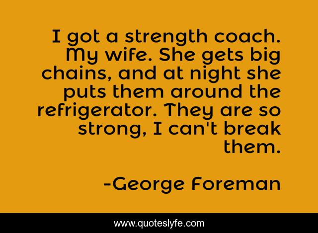 This page presents the quote "I got a strength coach. My wife. She gets big chains, and at night she puts them around the refrigerator. They are so strong, I can't break them.". Author of this quote is George Foreman. This quote is about wife, strong, night,.