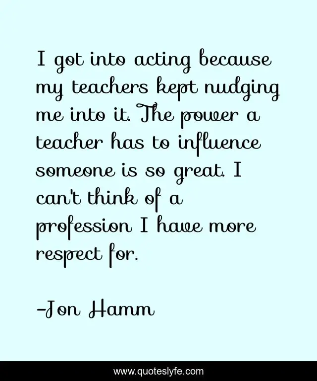 This page presents the quote "I got into acting because my teachers kept nudging me into it. The power a teacher has to influence someone is so great. I can't think of a profession I have more respect for.". Author of this quote is Jon Hamm. This quote is about great, teacher, power,.