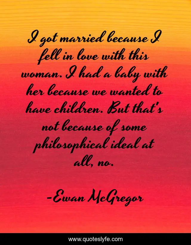 This page presents the quote "I got married because I fell in love with this woman. I had a baby with her because we wanted to have children. But that's not because of some philosophical ideal at all, no.". Author of this quote is Ewan McGregor. This quote is about marriage, actors, love, affection,.