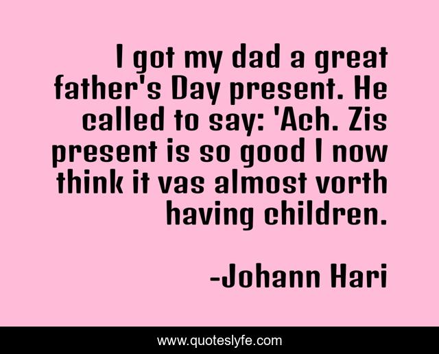 This page presents the quote "I got my dad a great father's Day present. He called to say: 'Ach. Zis present is so good I now think it vas almost vorth having children.". Author of this quote is Johann Hari. This quote is about twitter, children, presents, parents, father-s-day, 2011, fathers,.