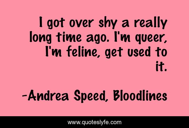 This page presents the quote "I got over shy a really long time ago. I'm queer, I'm feline, get used to it.". Author of this quote is Andrea Speed, Bloodlines. This quote is about humor, honesty,.