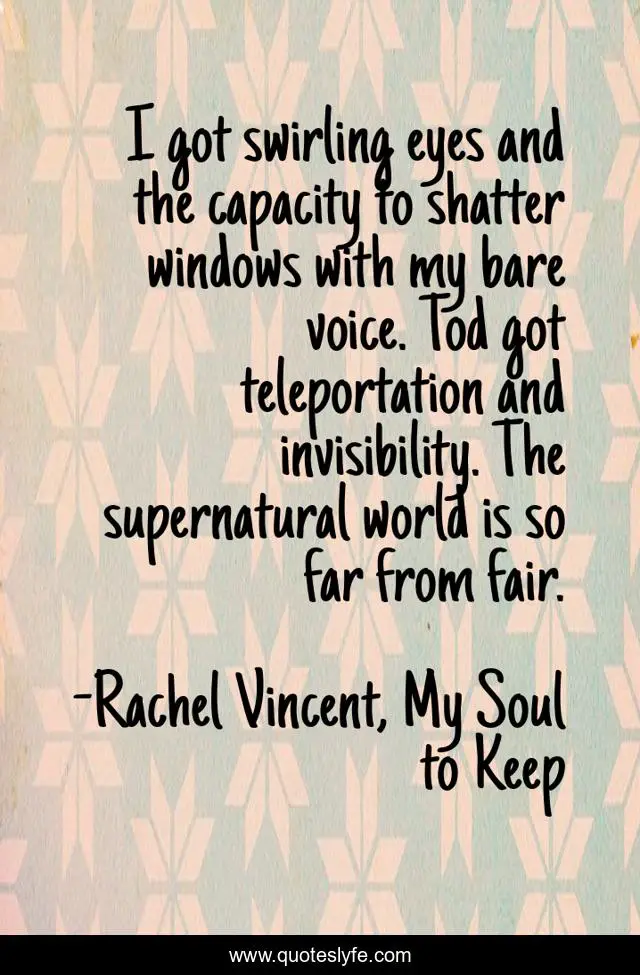 This page presents the quote "I got swirling eyes and the capacity to shatter windows with my bare voice. Tod got teleportation and invisibility. The supernatural world is so far from fair.". Author of this quote is Rachel Vincent, My Soul to Keep. This quote is about supernatural, humour,.