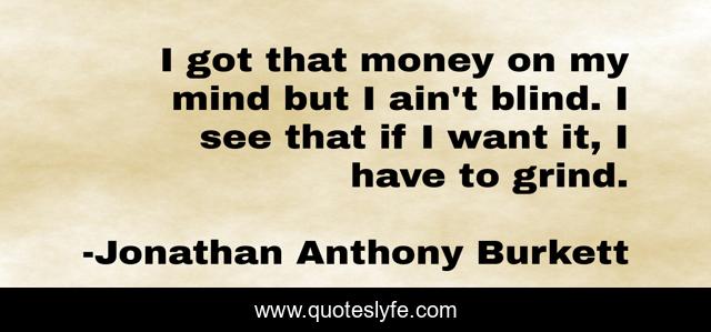This page presents the quote "I got that money on my mind but I ain't blind. I see that if I want it, I have to grind.". Author of this quote is Jonathan Anthony Burkett. This quote is about work-life-balance, grind-hard, work-hard, money, hiphop, never-give-up, challenge-inspiration-motivation, jonathan-anthony-burkett,.