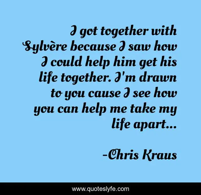 This page presents the quote "I got together with Sylvère because I saw how I could help him get his life together. I'm drawn to you cause I see how you can help me take my life apart...". Author of this quote is Chris Kraus. This quote is about lust, self-destruction, idolisation, oh-my,.