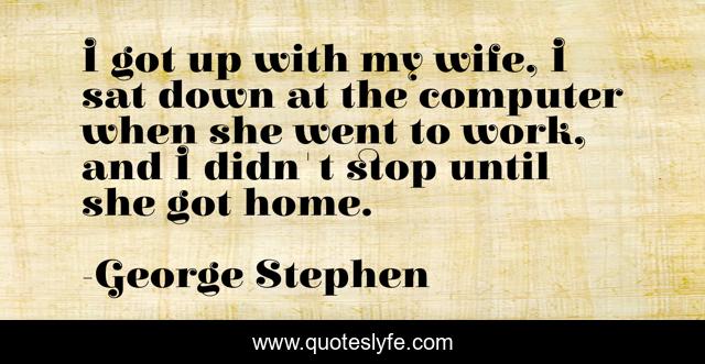 This page presents the quote "I got up with my wife, I sat down at the computer when she went to work, and I didn't stop until she got home.". Author of this quote is George Stephen. This quote is about home, work, wife,.