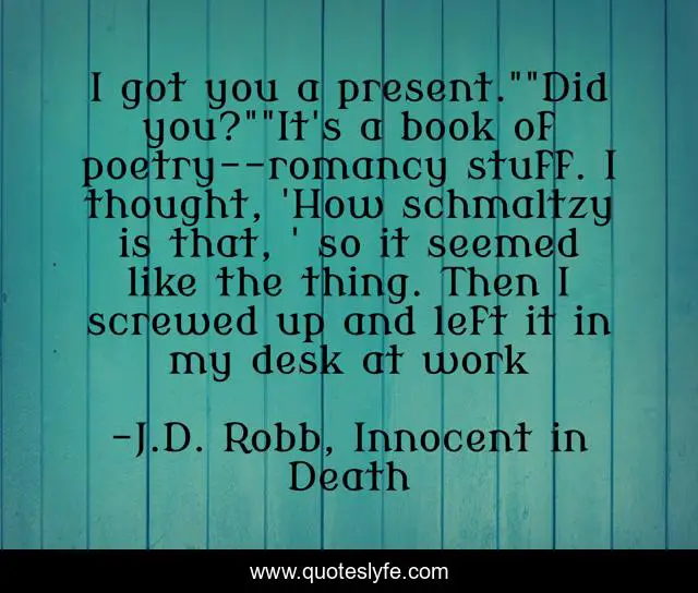 This page presents the quote "I got you a present.""Did you?""It's a book of poetry--romancy stuff. I thought, 'How schmaltzy is that, ' so it seemed like the thing. Then I screwed up and left it in my desk at work". Author of this quote is J.D. Robb, Innocent in Death. This quote is about eve-dallas, present, roarke,.