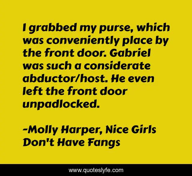 This page presents the quote "I grabbed my purse, which was conveniently place by the front door. Gabriel was such a considerate abductor/host. He even left the front door unpadlocked.". Author of this quote is Molly Harper, Nice Girls Don't Have Fangs. This quote is about funny, molly-harper, gabriel, nice-girls-don-t-have-fangs, jane-jameson, comedy,.