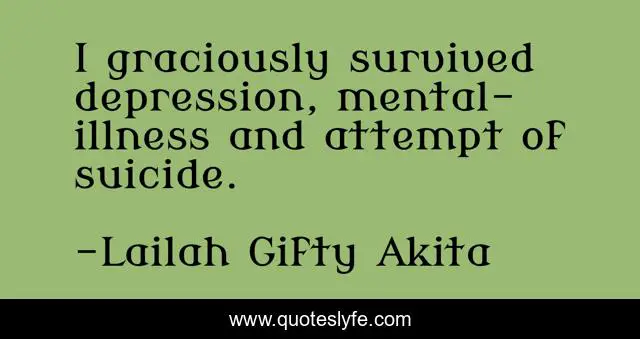 This page presents the quote "I graciously survived depression, mental-illness and attempt of suicide.". Author of this quote is Lailah Gifty Akita. This quote is about survival-instinct, suicide, positive-motivation, inspiring, experience, challenges, encouragement, life-lessons, overcomer,.