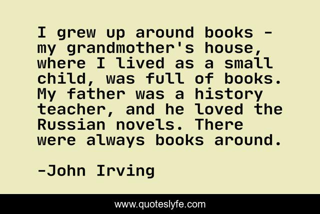 This page presents the quote "I grew up around books - my grandmother's house, where I lived as a small child, was full of books. My father was a history teacher, and he loved the Russian novels. There were always books around.". Author of this quote is John Irving. This quote is about history, father, child,.