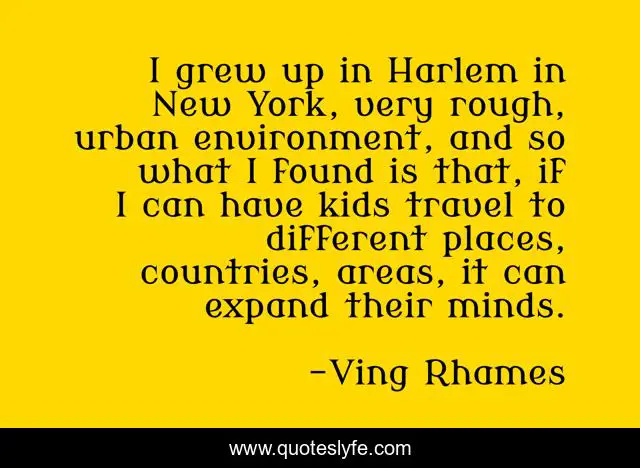 This page presents the quote "I grew up in Harlem in New York, very rough, urban environment, and so what I found is that, if I can have kids travel to different places, countries, areas, it can expand their minds.". Author of this quote is Ving Rhames. This quote is about environment, new york, kids,.