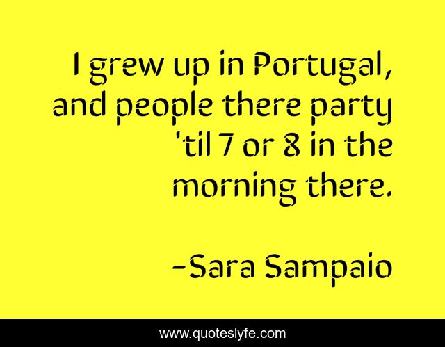 This page presents the quote "I grew up in Portugal, and people there party 'til 7 or 8 in the morning there.". Author of this quote is Sara Sampaio. This quote is about party, up, people,.